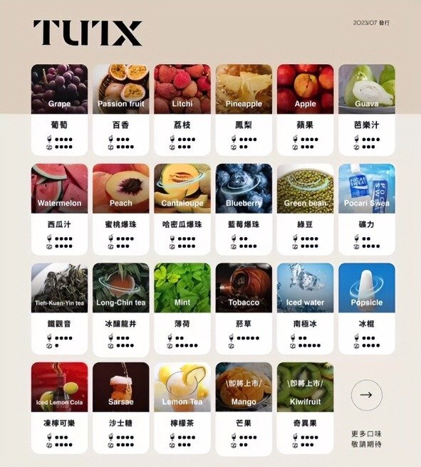 • TUTX 透明煙彈系列精選21種經典口味,涵蓋水果、茶飲、薄荷及煙草等多元風味,滿足不同偏好。